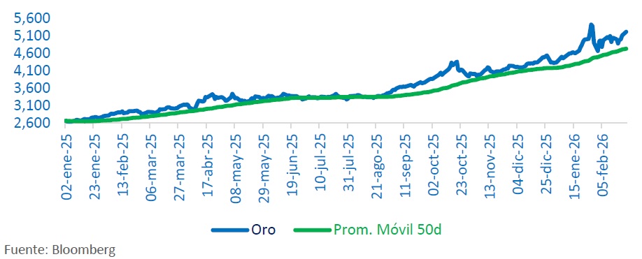 Durante las últimas semanas, el oro ha mantenido un comportamiento altamente dinámico, reflejando tanto episodios de presión como de recuperación tras haber alcanzado niveles récord a finales de enero. El metal inició febrero con movimientos amplios asociados a ajustes especulativos y a una mayor cautela entre los inversionistas, en un entorno en el que las modificaciones en la operativa de mercados asiáticos y tensiones geopolíticas reforzaron la demanda de activos de refugio. Hoy, el commodity extiende su proceso de recuperación y supera nuevamente los $5,200.0 dólares por onza (+2.05% en la sesión), impulsado por un renovado episodio de incertidumbre comercial en Estados Unidos, tras el anuncio de un arancel global de 15.0% por parte del gobierno de Estados Unidos, luego de que la Corte Suprema limitó el uso de facultades de emergencia para imponer tarifas. Los mercados también incorporan señales mixtas relacionadas con la actividad económica estadounidense y con la evolución de las tensiones diplomáticas en Medio Oriente.