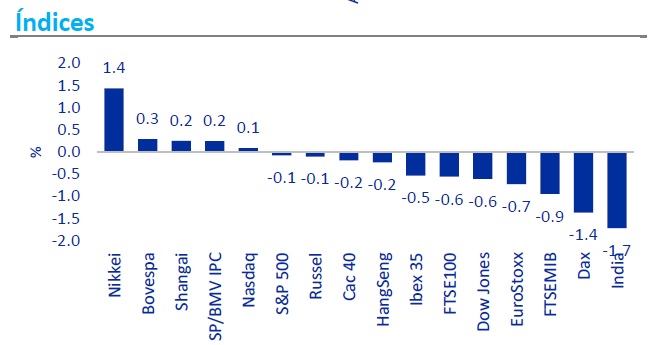 - Mercados accionarios en EUA mixtos y en México con ganancias.